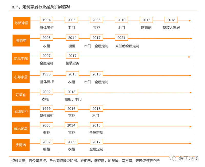 头部定制企业已逐步完成产品拓展,具备提供整家全屋产品能力。此前定制企业多为单品橱衣柜、空白渠道拓展策略,伴随市场需求多元化,以及企业能力提升,橱柜企业逐步拓展衣柜、木门等品类,衣柜企业也向橱柜、墙板等品类渗透,以满足消费者一站式、个性化的需求。